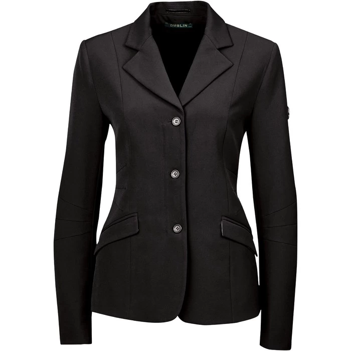 Tailored competition softshell jacket that is water repellant and breathable. Stretch fabric allows easy freedom of movement for comfort. Fully lined. Machine washable for easy maintenance. Stylish button detail on front & cuffs. Hidden center zip closure. Hanger and garment bag included.