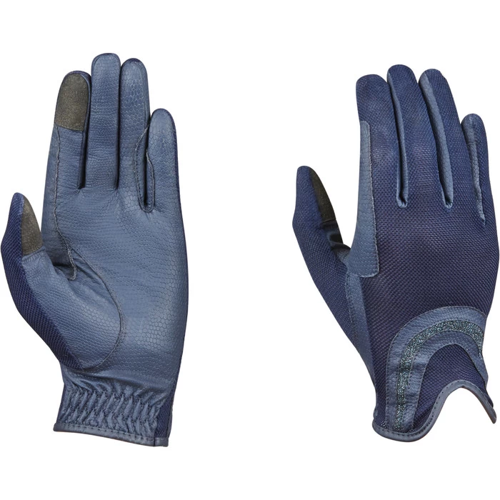 Made from a super soft drum dyed goat analine leather with air vented mesh covers that cover the back of the hand for breathability with glitter detail. Featuring an elasticated wristband for easy on/off.