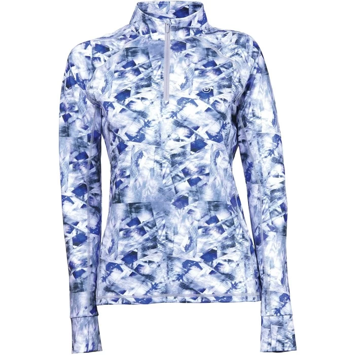 The Dublin Sapphire Print Long Sleeve top is made from stretch Comfort Dry jersey fabric, which makes it a perfect base layer. Comfort Dry fabric that performs for you in all types of weather, ensuring any moisture dries quickly to keep you cool, comfortable, and dry. The Dublin Sapphire top has a shaped body with a flattering contoured fit combined with a stand-up collar and quarter zip placket. The digital print design coordinates with Dublin legwear and jackets to create the perfect outfit. Made from 90% polyester, and 10% elastane, and available in sizes Ladies XSmall to Ladies 2XLarge.