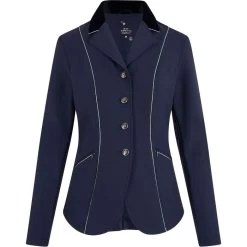 Chic tournament jacket with a beautiful fit and a glamorous touch. This stylish jacket with 4 shiny logo buttons features glittering, sparkling rhinestones on the zipped pockets at the front and on the rear straps in the back area. The shiny silver piping can be found all over this garment: on the front, on the zipped front pockets, along the edge of the collar, on the back, and along the rear strap. The collar is lined with fashionable velvet, and it features a shiny drawing on the back. This tailored jacket is lined with a net fabric that features a star pattern and has a high level of breathability. The front and the back are rounded and feature a double slot.